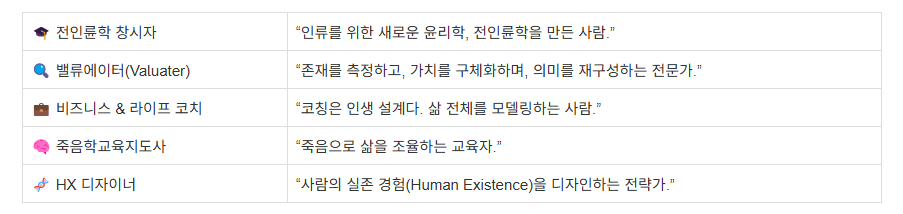 a 철학하는 실천가, a 죽음을 통해 삶을 설계하는 전인륜학자, and a 브랜드를 움직이는 코치-컨설턴트의 미래형.